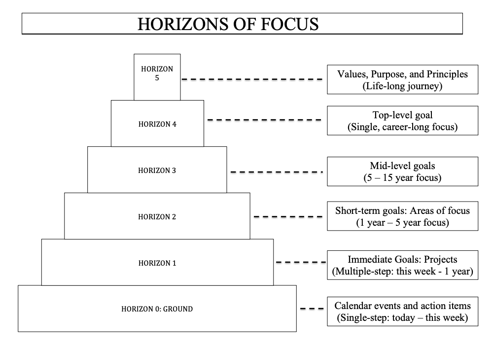 In this post, we explore the highest three levels of the horizons of focus model for organizing your goals. This is a continuation of my previous post on the same topic. The major purpose of this hierarchy is to support you in building strong motivation and grit as you work to complete your college degree. One powerful mechanism you can use to do so is to define, capture, and revise your goals on a routine basis.