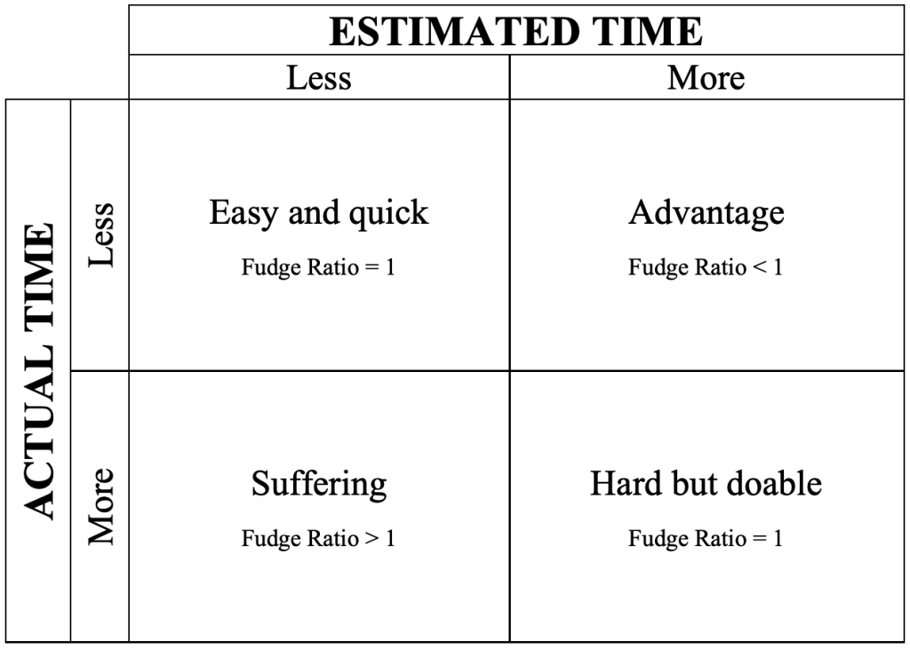 Let’s be clear: the advantage scenario represents an error in judgement. A fudge ratio less than one implies that you inaccurately predicted the amount of time you needed to finish a task. However, the consequences of this error put you at an advantage.