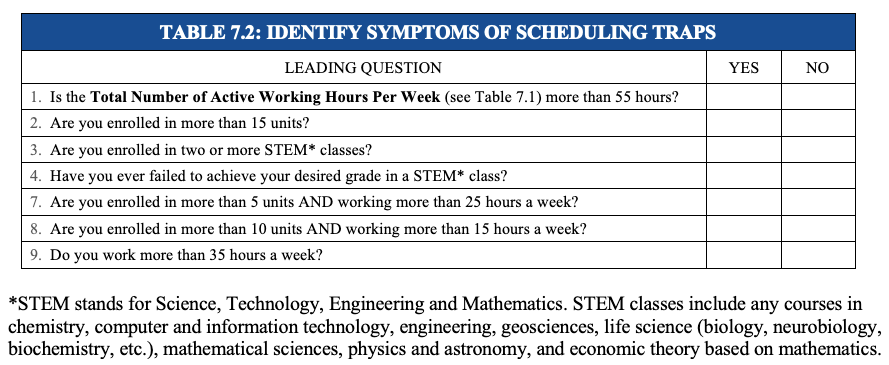 Each question in Table 7.2 above is designed to help you identify possible symptoms of scheduling traps. We believe you are genius, you are capable, and that you can thrive in every one of your college classes. However, many college students never learn how to earn the grades they want because they struggle to accurately predict how much time they need to spend studying to accomplish their academic goals. To address these type of scheduling issues, we want to help you build your self-awareness and to provide some gentle guidance.