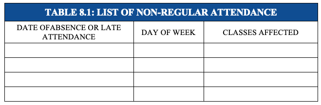 Figure: Table 8.1- List of Non-Regular Attendance. This table is designed to help you track the days you plan to arrive late or be absent from an in-class meeting. Having these dates in mind will empower you to plan ahead for these time conflicts.